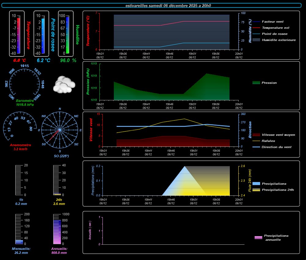 Attention, les données météo publiées sur ce site sont issues d'une station météo personnelle et sont données qu'à titre indicatif, elles ne peuvent en aucun cas être utilisées pour garantir la protection des personnes ou de biens quelconques.